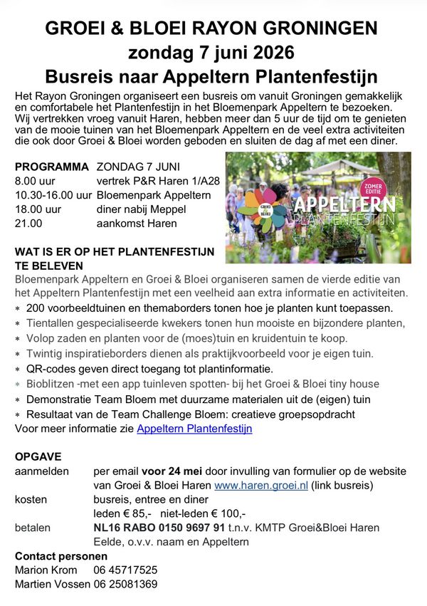Het Rayon Groningen organiseert een busreis om vanuit Groningen gemakkelijk en comfortabel het Plantenfestijn in het Bloemenpark Appeltern te bezoeken. Wij vertrekken vroeg vanuit Haren, hebben meer dan 5 uur de tijd om te genieten van de mooie tuinen van het Bloemenpark Appeltern en de veel extra activiteiten die ook door Groei & Bloei worden geboden en sluiten de dag af met een diner.
