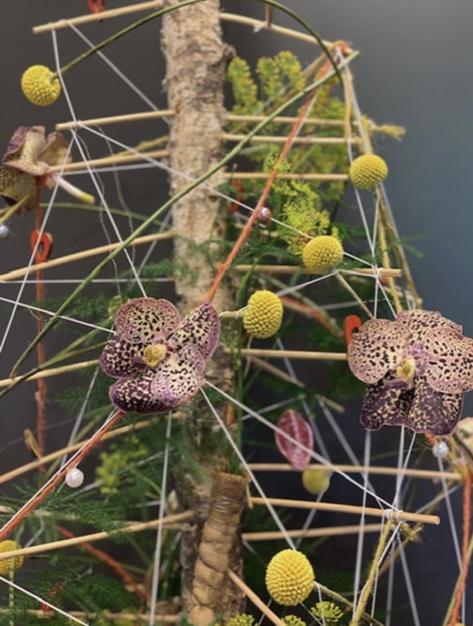 Deze les gaan we werken met iets van hout. Een stonk of tak vormt de basis en hier ga je een ruimte scheppende manier op werken. Het hout mag op een frame gezet worden of in een mooie schaal gelegd worden. Op onderstaande afbeeldingen zie je een voorbeeld van ruimte scheppend werken. Dit voorbeeld mag gevolgd worden maar je mag het natuurlijk ook helemaal zelf invullen!